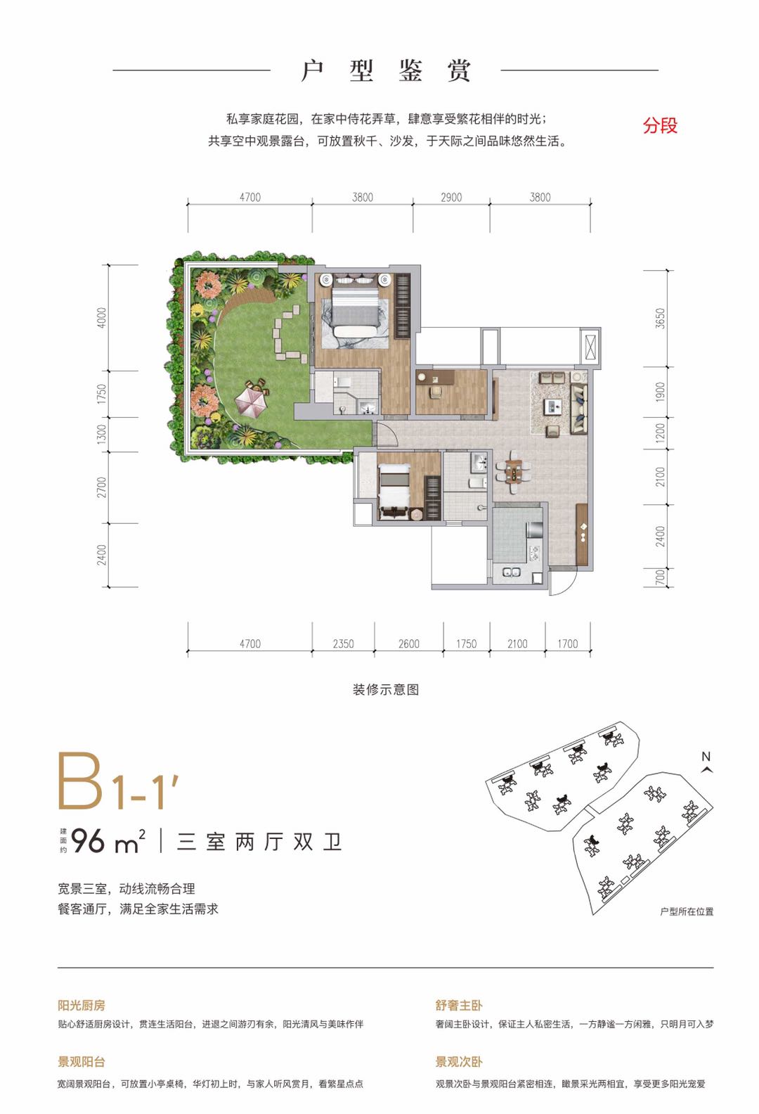 园林规划有林下、秘境、艺术、竹里、禅意、休憩、乐活、阳光等八大花园,礼仪两门厅、中心滨水会客厅、樱花双水岸、绿林漫步和艺术滨水双中庭,1200米健康跑环,林与水错落交织,于城市之中打造生态绿意生活。