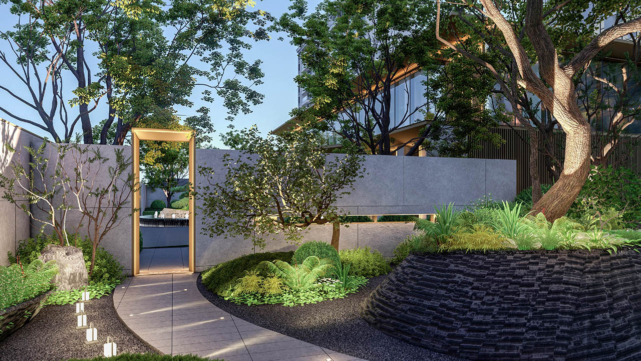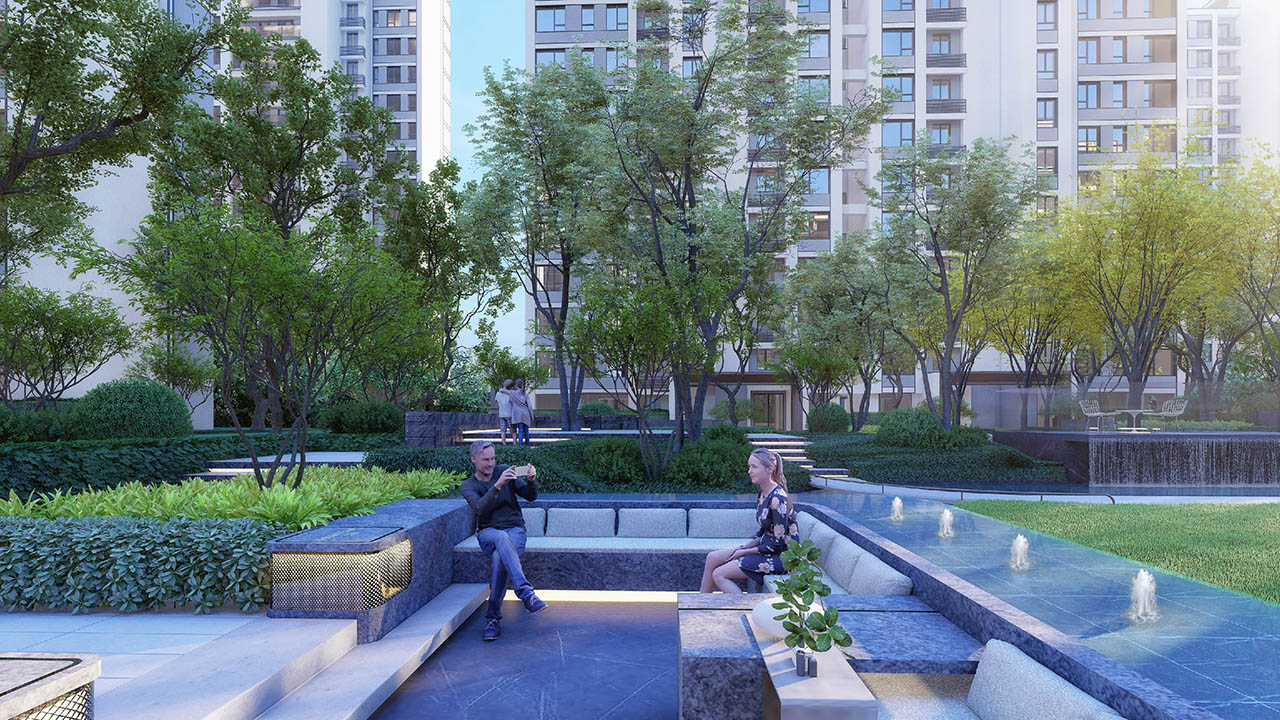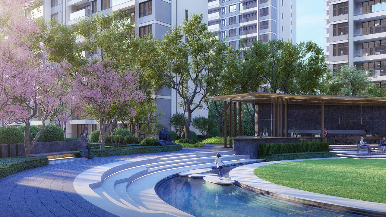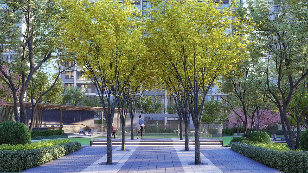 约7000㎡中轴景观,涵盖约3000㎡多功能中央草坪和约200米景观长廊,日常簇拥花间草木,让建筑与绿意和谐生长。
