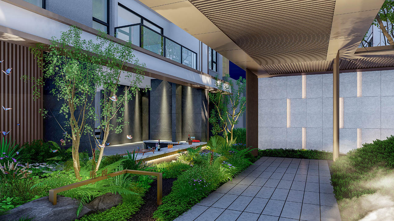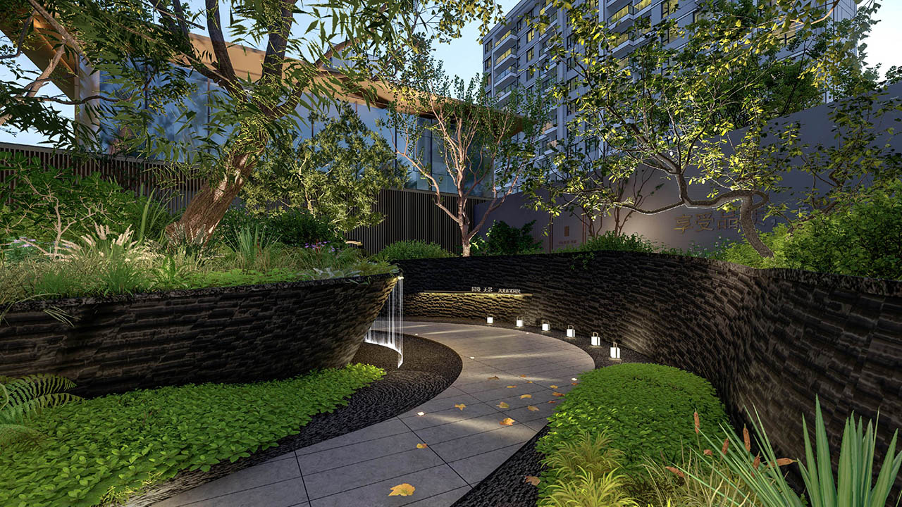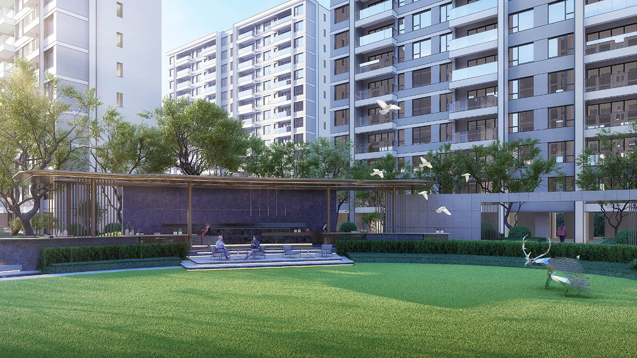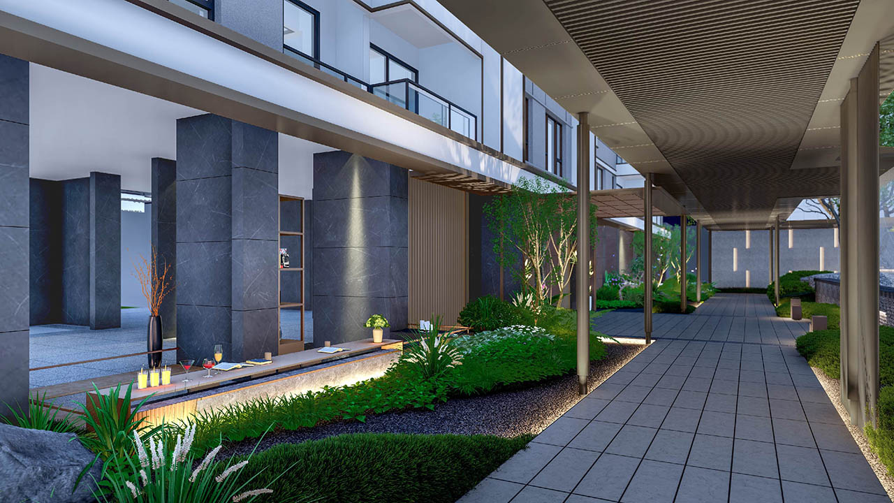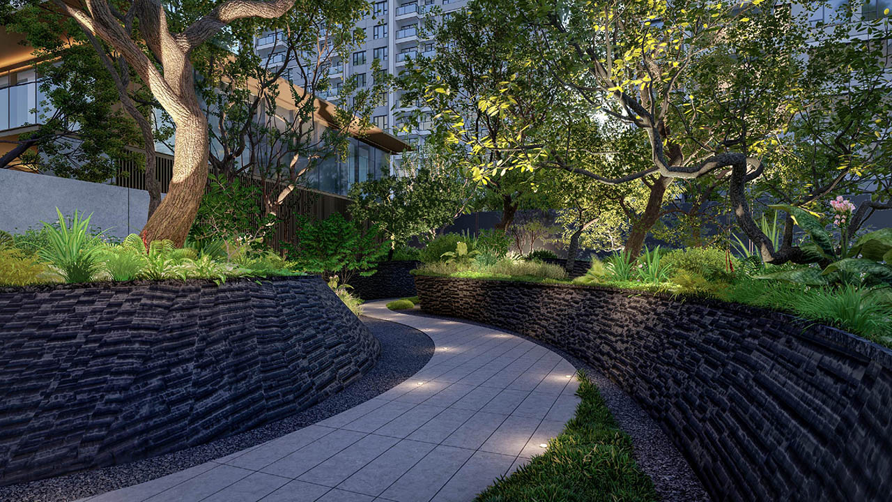 约7000㎡中轴景观,涵盖约3000㎡多功能中央草坪和约200米景观长廊,日常簇拥花间草木,让建筑与绿意和谐生长。