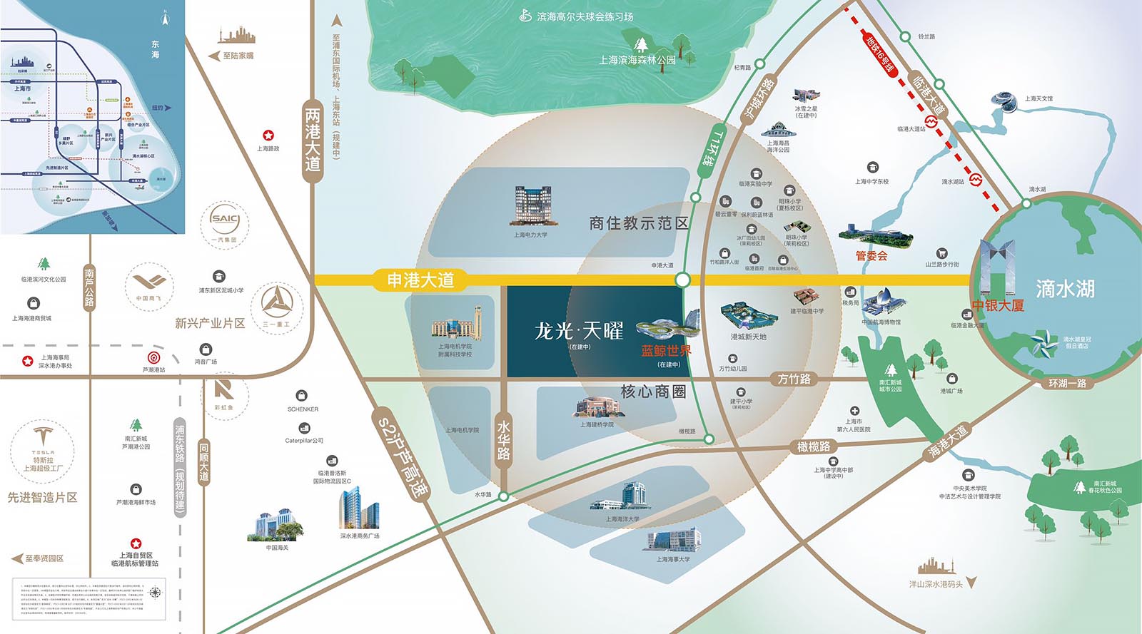 自带建面约13万方龙光蓝鲸世界购物中心(在建),体量超越临港万达广场和爱琴海购物公园(在建),可谓是未来临港中心。