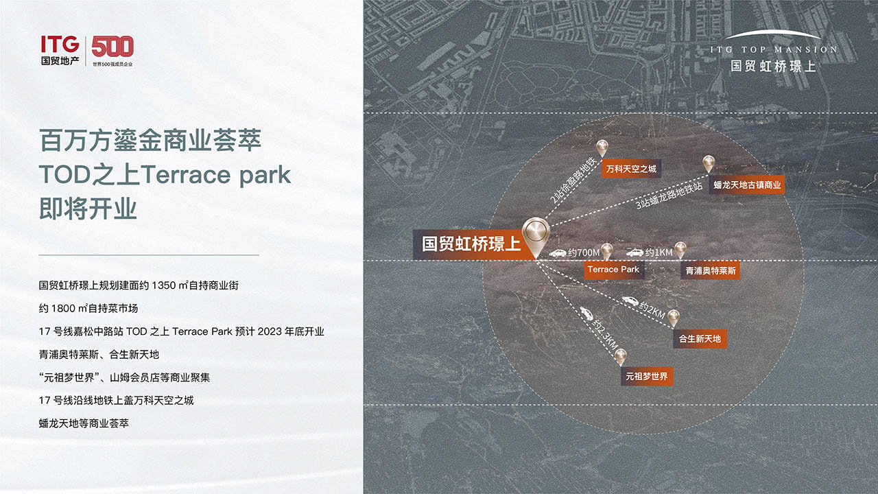 以国贸虹桥璟上为核心,三公里范围内,高能级资源聚集:上海宋庆龄学校、协和双语学校、德达医院等教育医疗资源,让成长无忧;还有TOD之上的Terrace Park,入驻商家数十家,未来出门即享繁华日常生活。