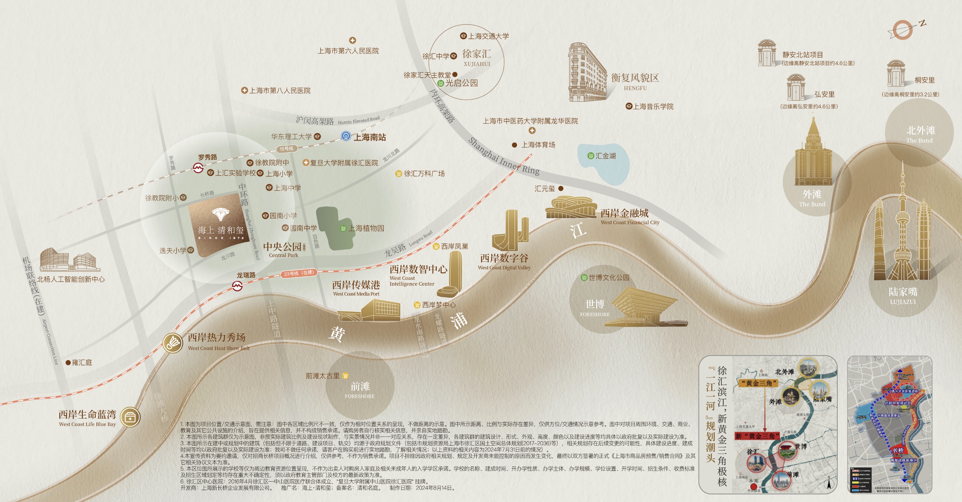 以住区为圆心,五公里范围内,尽享约700亿能级商业配套,徐汇滨江鼎级商圈、前滩鎏金商圈等,聚揽全球顶奢休闲之享;以近邻轨交15号线、23号线(在建中)的优越位置,打造舒适生活圈,生活、购物、休闲、学习、工作等全景生活图谱。